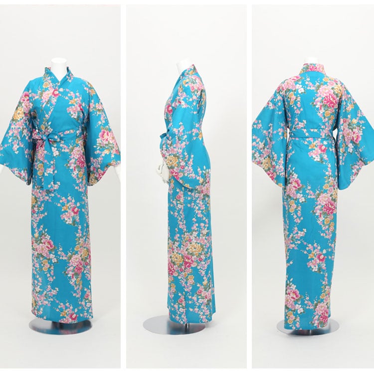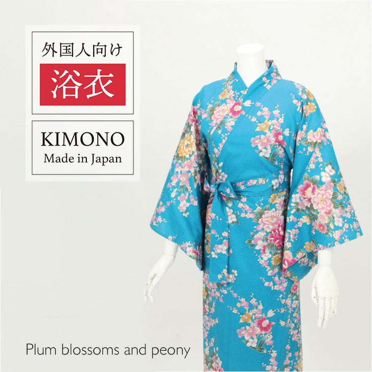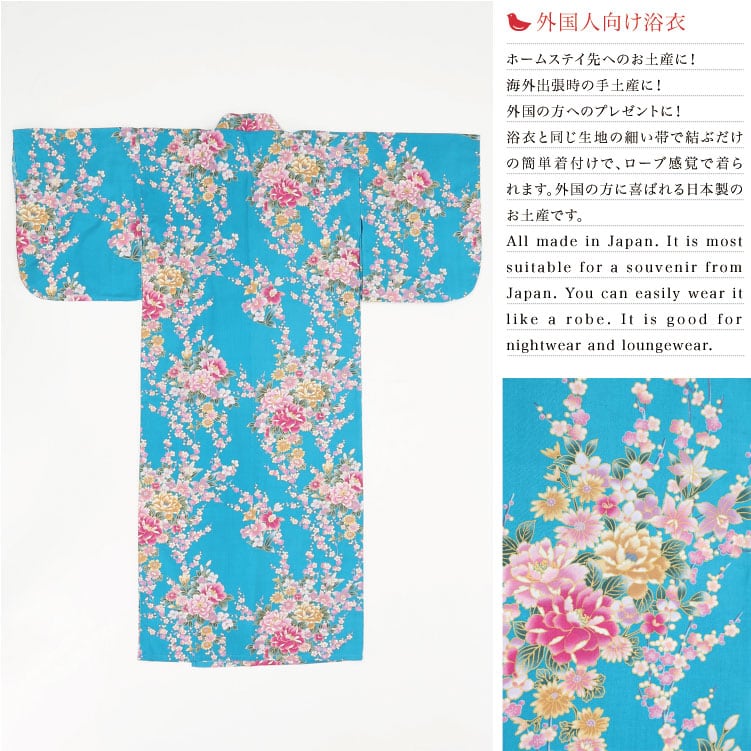【外国人向け浴衣】【お土産】【プレゼント】海外のお友達へのお土産やプレゼントにピッタリ! ターコイズにピンクの牡丹と蘭の花柄 日本製浴衣 レディース【日本のおみやげ】【日本のお土産】【外国へのお土産】