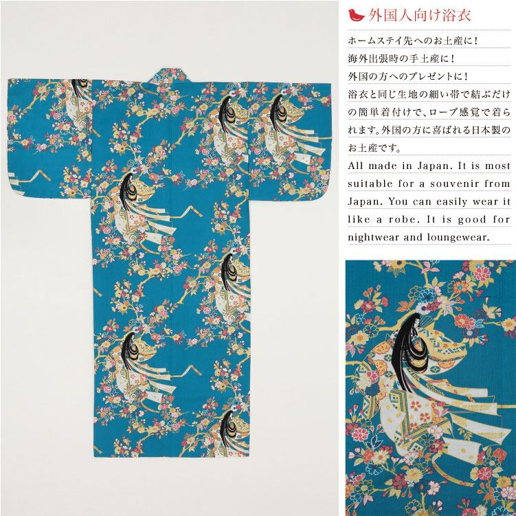 【外国人向け浴衣】【お土産】【プレゼント】海外のお友達へのお土産やプレゼントにピッタリ! 水色地に平安女性 姫桜 日本製浴衣 レディース【日本のおみやげ】【日本のお土産】【外国へのお土産】【外人 浴衣】