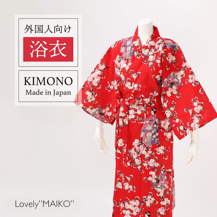 【外国人向け浴衣】【お土産】【プレゼント】海外のお友達へのお土産やプレゼントにピッタリ! 赤地に桜と舞妓 日本製浴衣 レディース HAPPI COAT【日本のおみやげ】【日本のお土産】【外国へのお土産】【外人 浴衣】