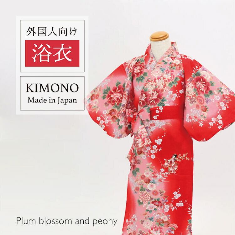 【外国人向け浴衣】【キッズサイズ】【1〜2歳サイズ】【お土産】【プレゼント】海外のお友達へのお土産やプレゼントにピッタリ! 赤地に梅・牡丹柄 日本製浴衣 子供用【日本のおみやげ】【日本のお土産】【外国へのお土産】【外人 浴衣】