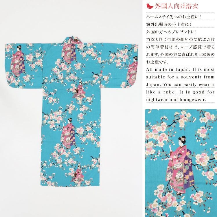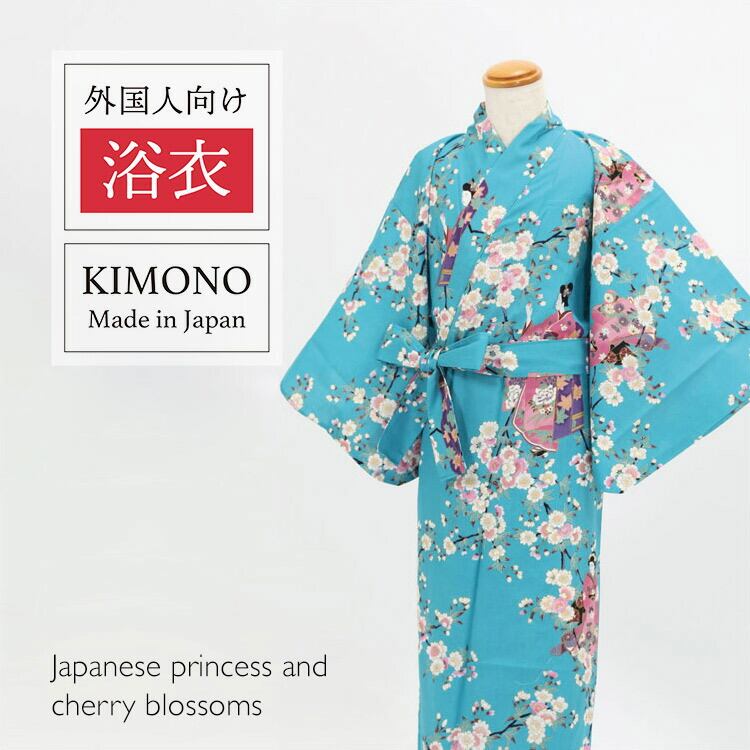【外国人向け浴衣】【キッズサイズ】【5〜6歳サイズ】【お土産】【プレゼント】海外のお友達へのお土産やプレゼントにピッタリ! 水色地に姫と桜柄 日本製浴衣 子供用【日本のおみやげ】【日本のお土産】【外国へのお土産】【外人 浴衣】