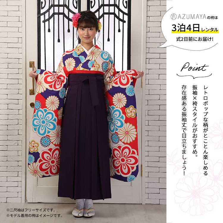 【レンタル】 卒業式 袴 レンタル 女 女性 フルセット 卒業式袴セット2尺袖着物&袴フルセットレンタル 安い 大学 振袖×袴 「赤紫地 大花 ポップ」