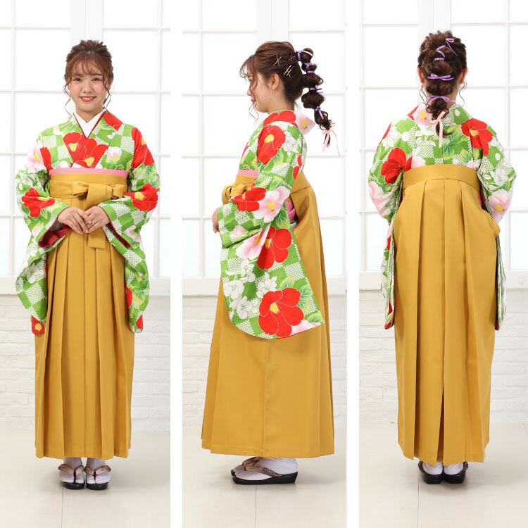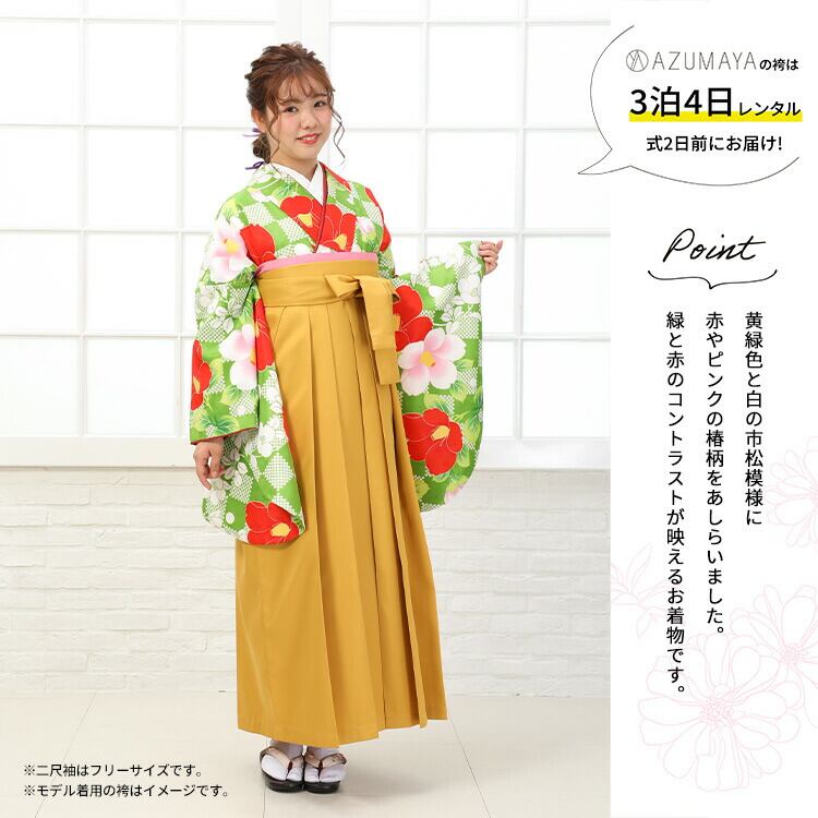 【レンタル】 卒業式 袴 レンタル 女 女性 フルセット 卒業式袴セット2尺袖着物&袴フルセットレンタル 安い 大学 夢千代「黄緑の市松模様に赤とピンクの椿柄」