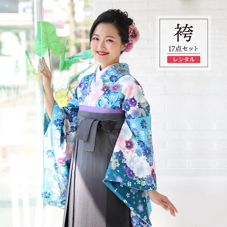 【レンタル】 卒業式 袴 レンタル 女 女性 フルセット 卒業式袴セット2尺袖着物&袴フルセットレンタル 安い 大学 「水色 桜柄」