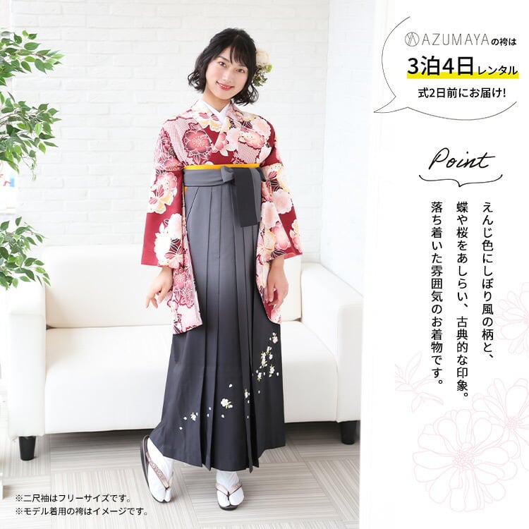 【レンタル】 卒業式 袴 レンタル 女 女性 フルセット 卒業式袴セット2尺袖着物&袴フルセットレンタル 安い 大学「しぼり風のエンジに桜・蝶柄 古典柄」